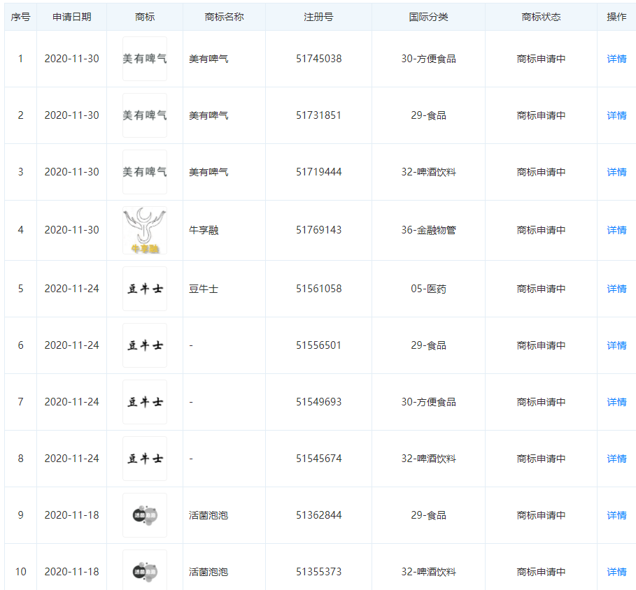 “美有啤气”“豆牛士”等,商标国际分类涉及方便食品、啤酒饮料、医药等。商标状态均显示为“商标申请中”。
