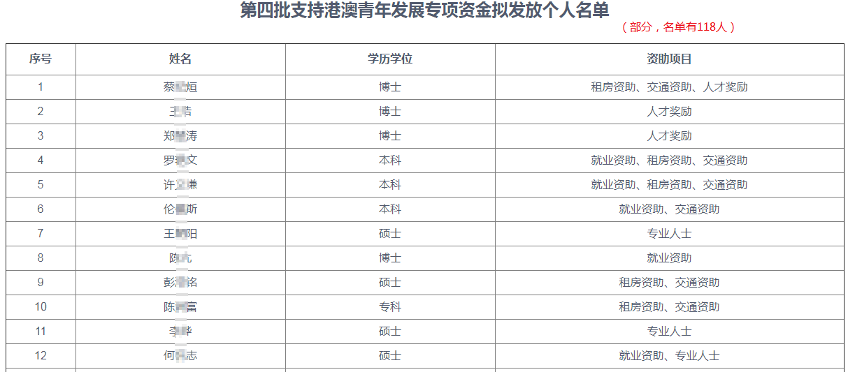 近期深圳市仁港永胜管理局发布《关于第四批支持港澳青年发展专项资金拟发放名单的公示》,有118位港澳青年获得专项扶持补贴,主要有就业资助、租房资助、交通资助、人才奖励和专业人士这几项补贴内容。